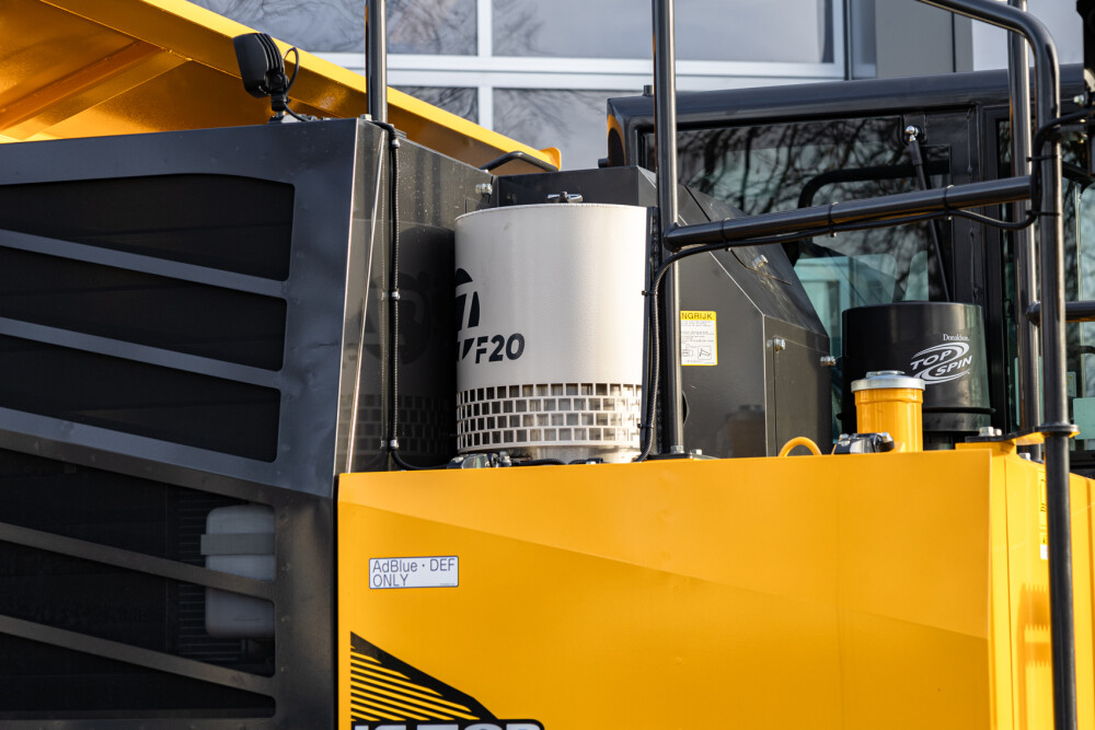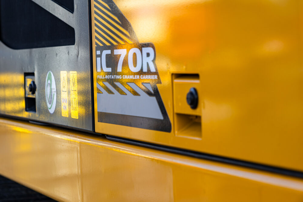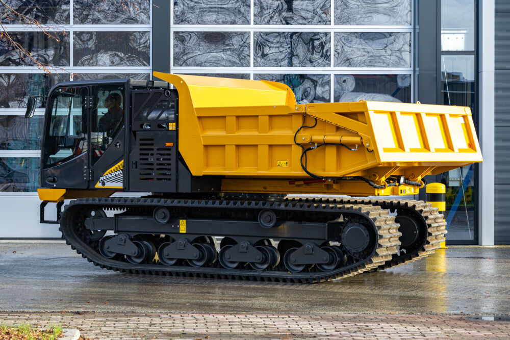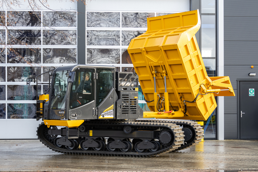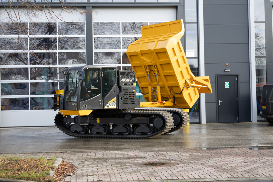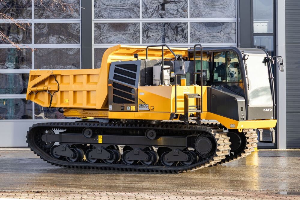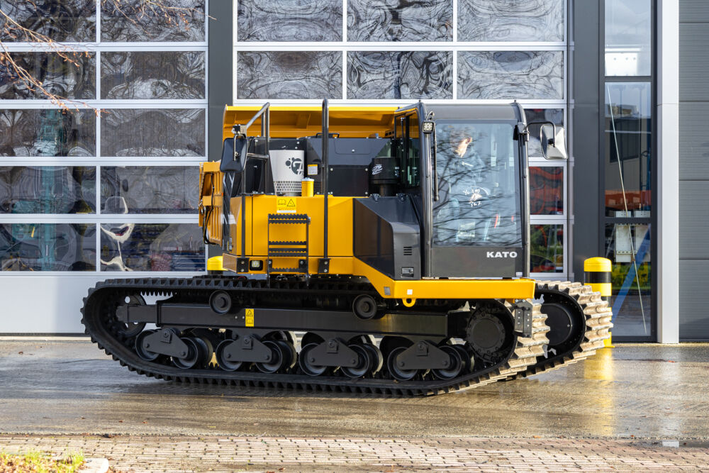 The 11.6-ton KATO crawler carrier on 700-millimeter-wide rubber tracks has an engine power of 190 hp, low fuel consumption and a travel speed of up to 12 km/h. The 360° rotating superstructure ensures significantly less damage to the soil structure. The low 2.70 m cab structure allows transport on a bucket truck in many cases. The lower dead weight offers an advantage when transporting two dumpers on one combination (truck).